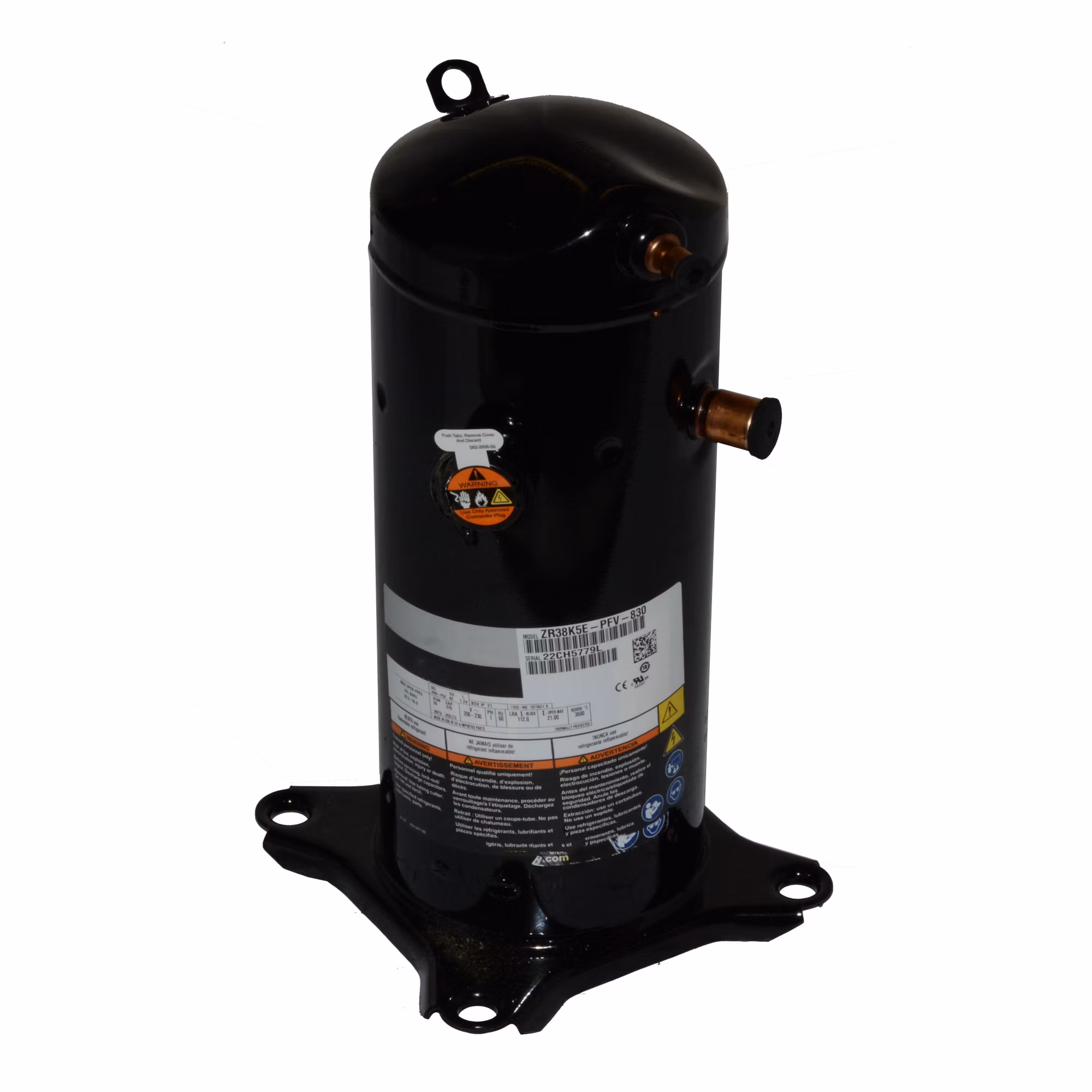Factory Authorized Parts – ZR38K5E-PFV-830 Copeland Scroll Compressor 208/230V 1Ph, R22, 21.4 RLA, 38000 Capacity – E:Mail: sales@walkair.us to confirm availability or for volume discounts